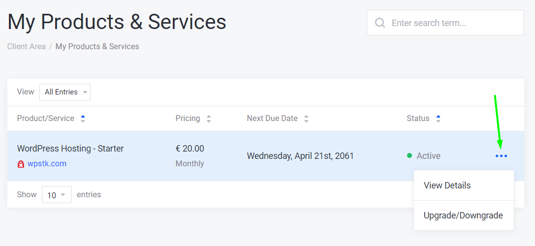 Inside your Client Area navigate to "My Products & Services", choose the service in question and select "Upgrade/Downgrade" from the menu.